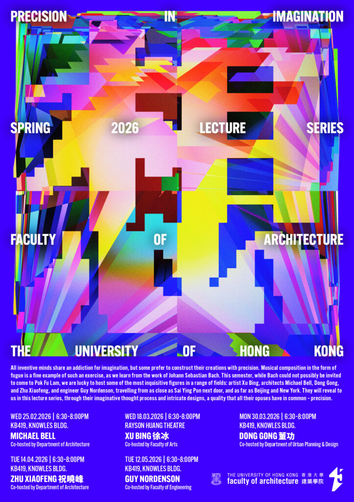 All inventive minds share an addiction for imagination, but some prefer to construct their creations with precision. Musical composition in the form of fugue is a fine example of such an exercise, as we learn from the work of Johann Sebastian Bach. This semester, while Bach could not possibly be invited to come to Pok Fu Lam, we are lucky to host some of the most inquisitive figures in a range of fields: artist Xu Bing, architects Michael Bell, Dong Gong, and Zhu Xiaofeng, and engineer Guy Nordenson, travelling from as close as Sai Ying Pun next door, and as far as Beijing and New York. They will reveal to us in this lecture series, through their imaginative thought process and intricate designs, a quality that all their opuses have in common – precision.